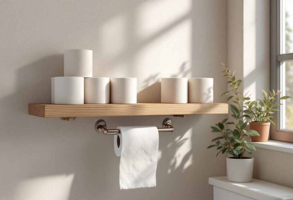 Les étagères constituent une excellente solution de stockage pour le papier toilette. Elles permettent de libérer de l’espace au sol et de garder vos rouleaux facilement accessibles. Optez pour des étagères ouvertes où les rouleaux de papier peuvent être empilés verticalement. Cela ajoutera une touche décorative à votre salle de bain tout en étant fonctionnel.